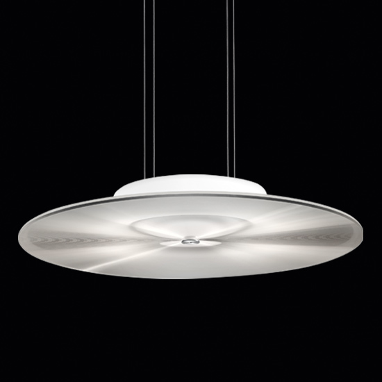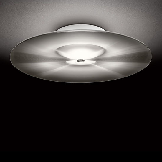 Sospensione e plafoniera per interni a luce diffusa, dimmerabile da comandi di tipo tradizionale, vocale e Casambi. Un disco trasparente con mini-prismature antiabbaglianti, rifrange la luce emessa dall’elemento diffondente superiore e la concentra verso il basso dando forma ad una lampada dal particolare effetto ottico. La luce diffusa e schermata di Fludd rende la versione sospesa adatta per installazioni a qualsiasi altezza mentre la versione a plafone illumina anche il soffitto. L’alto Indice di Resa Cromatica (CRI) garantisce il rispetto della percezione dei colori e la corretta illuminazione dell’ambiente.